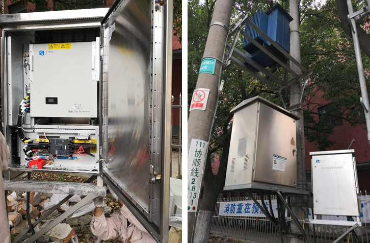 燦能公司一套CN-SPC-100kvar三相不平衡治理裝置落架安裝于電線桿上,如圖所示。設(shè)備投入運行后,該變壓器低壓側(cè)三相負載電流不平衡情況得到了顯著改善,三相電流不平衡度也從安裝之前最大的70%降低到20%以內(nèi)(供電公司用電采集系統(tǒng)數(shù)據(jù)),功率因數(shù)也得到了提高。